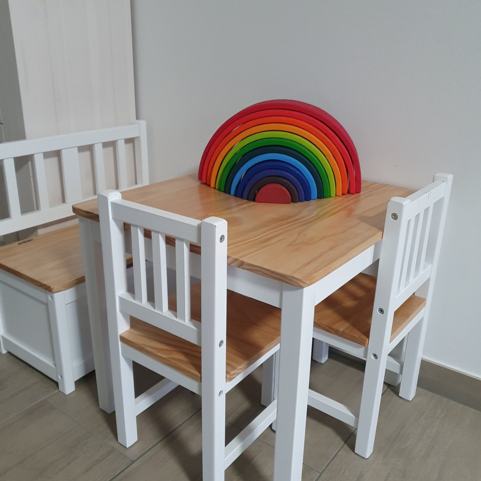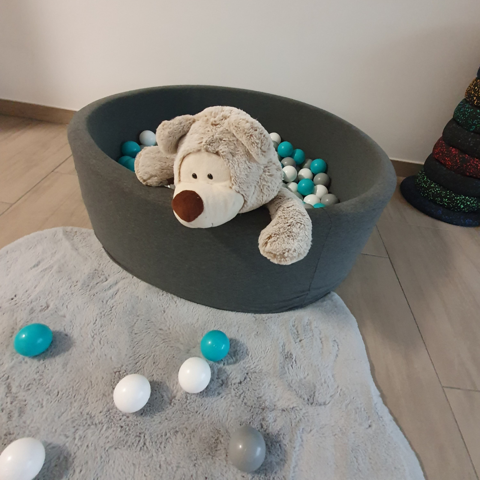 oder im Schlafzimmer getrennt unterzubringen. Des Weiteren befindet sich in diesem Raum ein Indoor Klettergerüst, Turnmatten, Stapelsteine, Bewegungslandschafts Material zum Turnen und bewegen. Ebenfalls befindet sich in